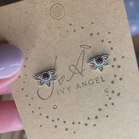 Sterling silver lotus style bow stud earrings for pierced ears. Featuring black agate centres