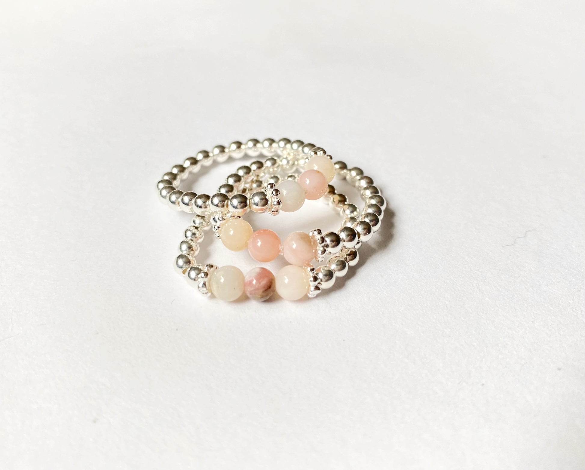 Three natural stones strung between sterling silver beads make up these sterling silver gemstone rings.